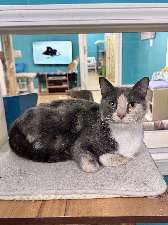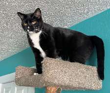 Sissy is a slim, elegant tuxedo girl with a charming white blaze on the bridge of her nose. She’s curious by nature and loves exploring high and low to find the perfect cozy spot to relax. While she can be a little shy around other cats at first, Sissy is a sweet, gentle companion who enjoys a calm environment and kind attention. Sissy has a mild condition called pillow paw, which can cause occasional swelling in her front paws. It’s usually not an issue in her day-to-day life, but a future adopter should be aware that it may require a vet visit and medication if it ever flares up. As long as she stays healthy and stress-free, it hasn’t caused her any trouble. Sissy would thrive in a patient, loving home where she can feel safe, comfortable, and adored.